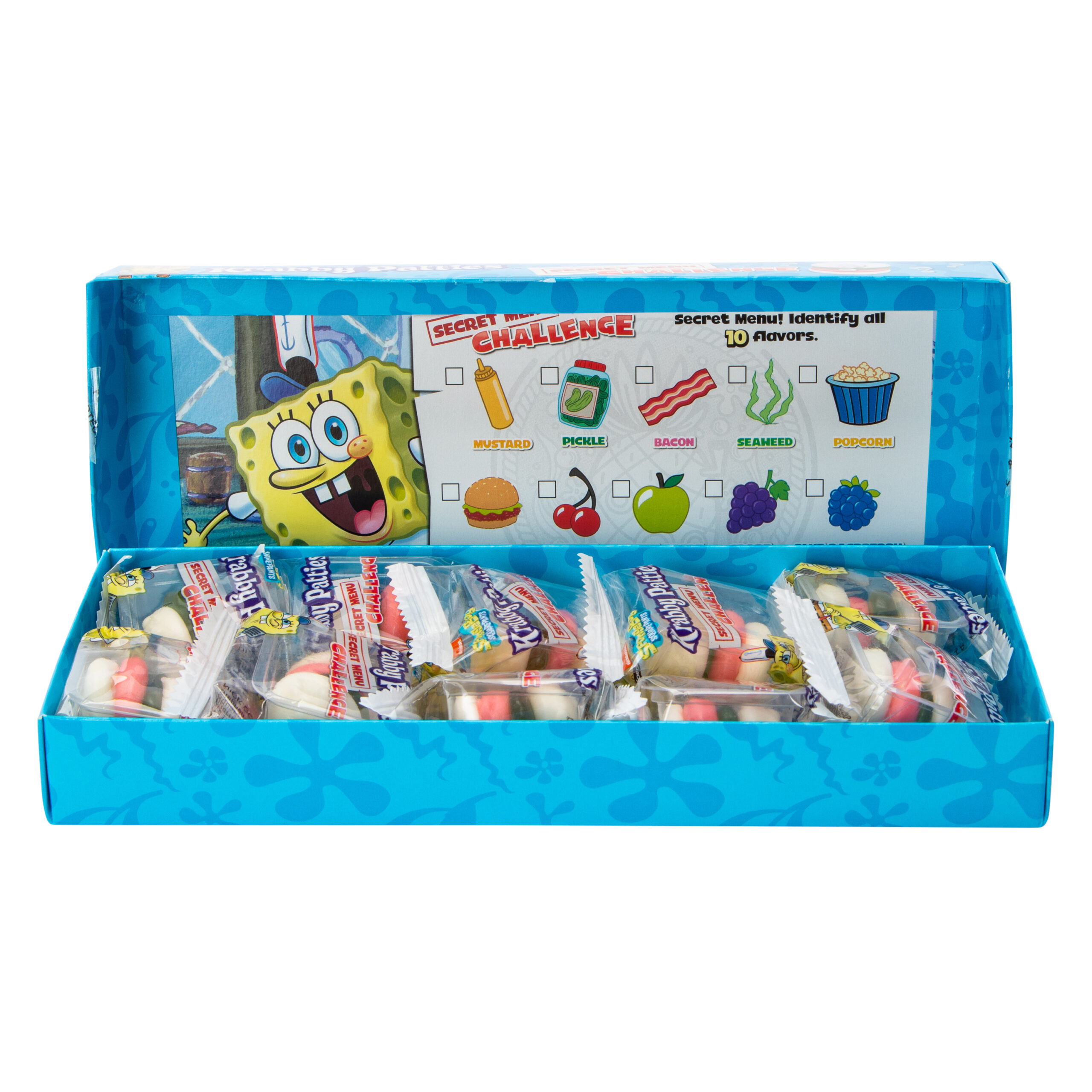 Îndrăznește să te scufunzi în necunoscut, cu noua noastră provocare de testare a gustului din KRABBY Patties Gummy Candy Secret Menu Challenge 90g! Această ediție specială de burgeri gummy Krabby Patties, albi, conține un sortiment de zece arome misterioase care vă vor lăsa papilele gustative să ghicească.